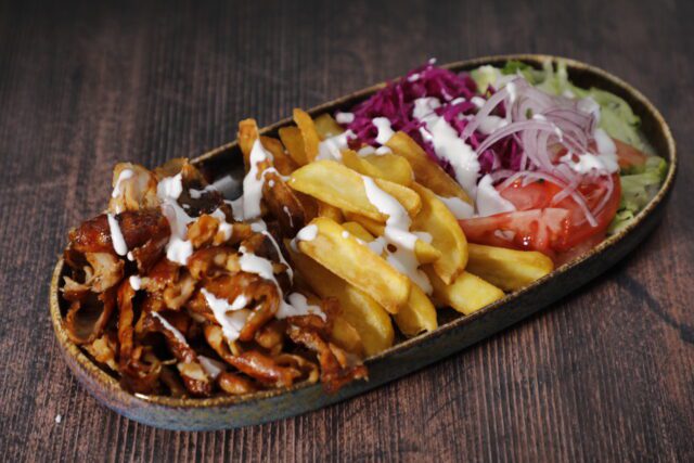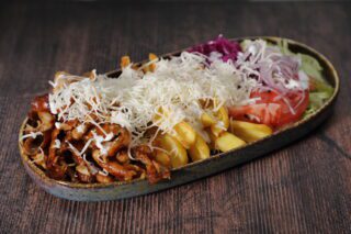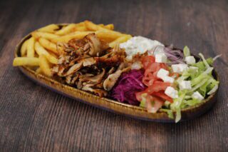 200g premium csirke hús, paradicsom, lilahagyma, joghurtos öntet, feta sajt, tzatziki, kígyóuborka, friss saláta, köret